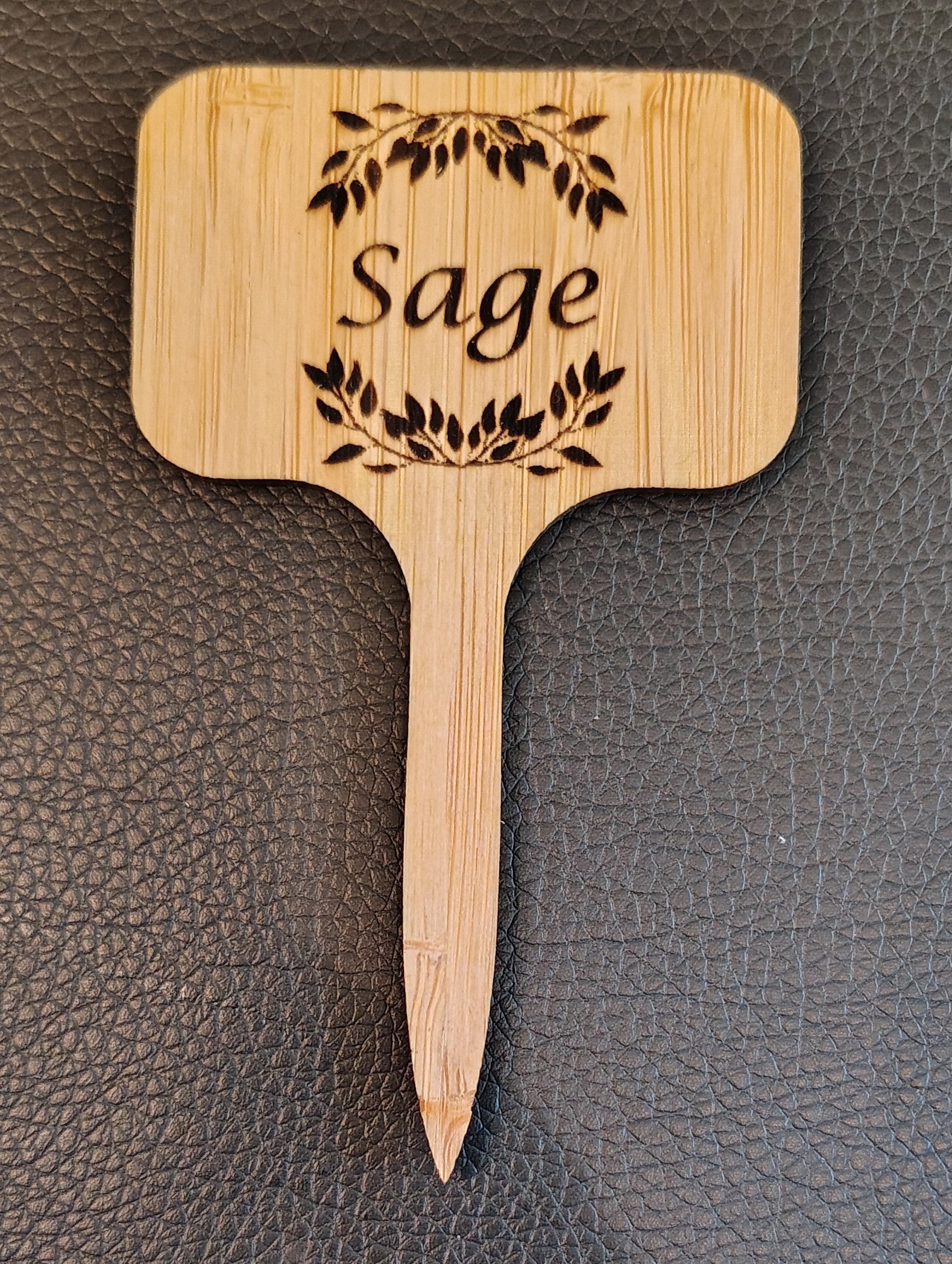 Laser engraved bamboo plant marker. Approximately 2.25 inches wide, 4 inches long and 0.0625 thick.