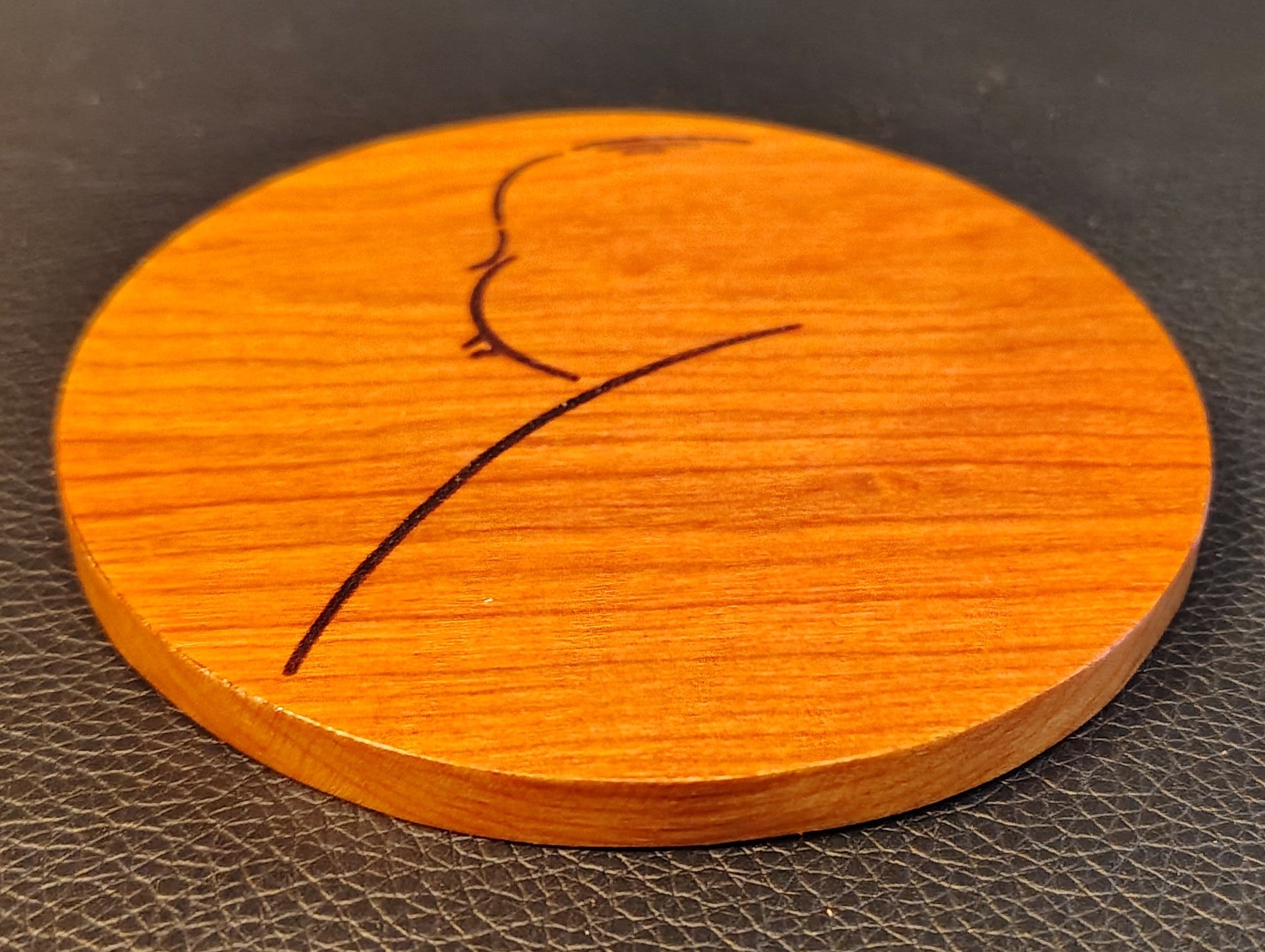 Solid cherry hardwood coaster, laser engraved. Hand cut, hand sanded and hand finished with spar urethane to seal out moisture. Approximately 3.75 inches in diameter and 0.25 inches thick.