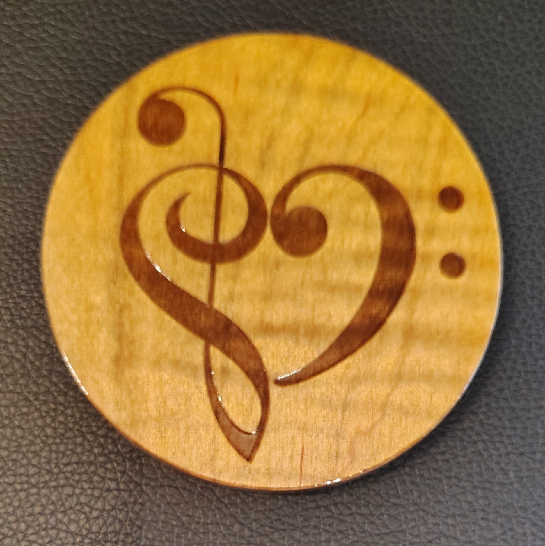 Solid cherry hardwood coaster laser engraved with music symbols treble and bass clef forming a heart. Hand cut, hand sanded and had finished to seal out moisture. Approximately 3.75 inches in diameter and 0.25 inches thick.
