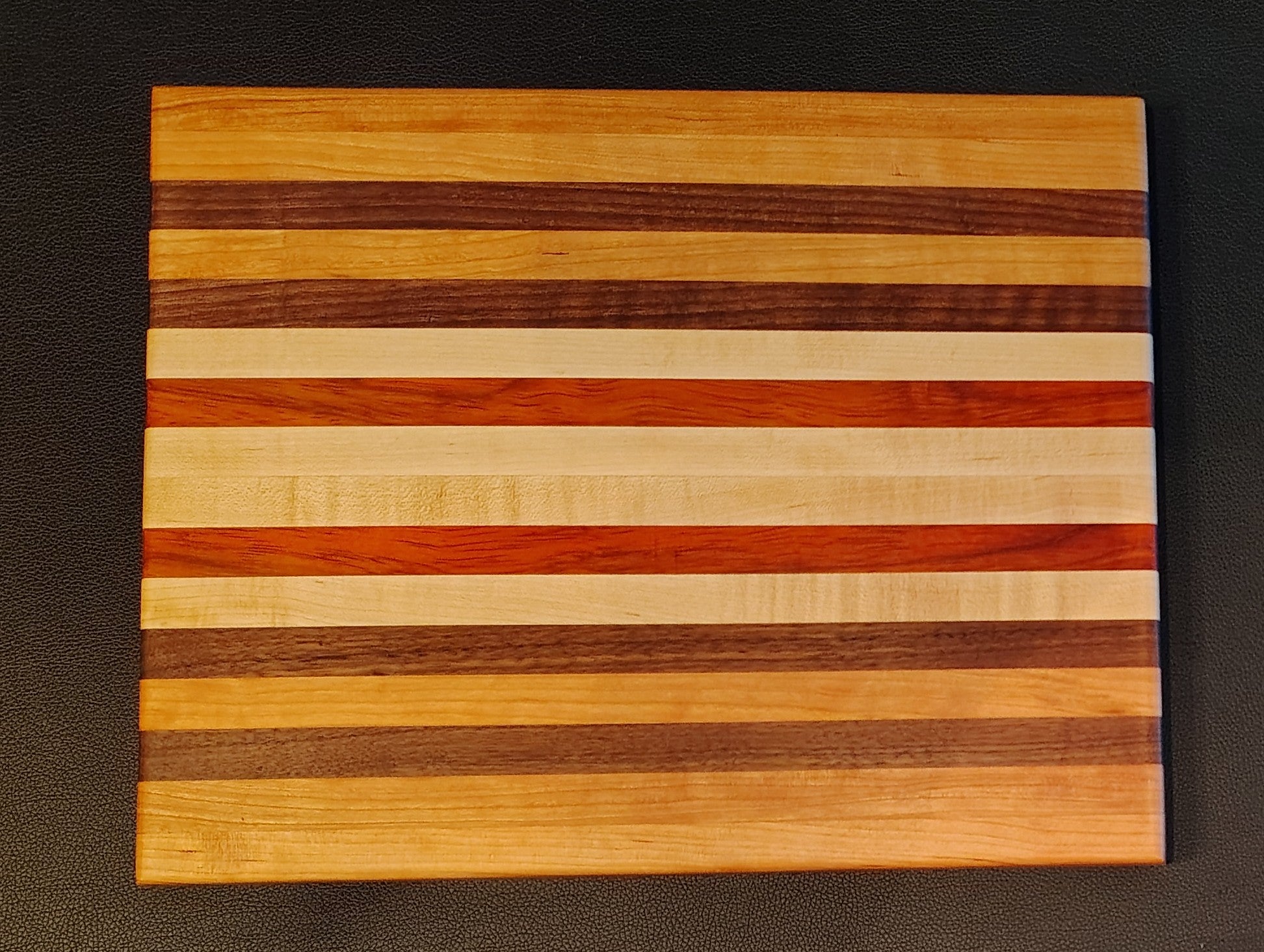 Edge-grain cutting board made from solid hardwoods: cherry, walnut, maple and padauk. Approximately 12 inches wide, 15 inches long and 0.75 inches thick.