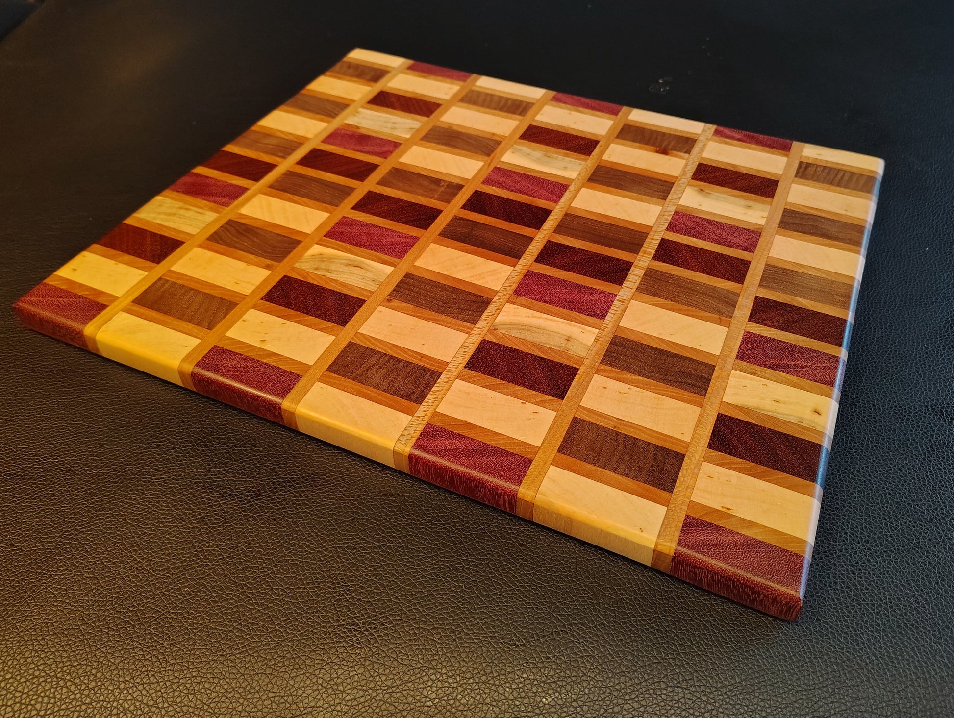 End-grain cutting board made with maple, walnut, purpleheart and cherry. Approximately 11.75 inches wide, 14 inches long and 0.75 inches thick.