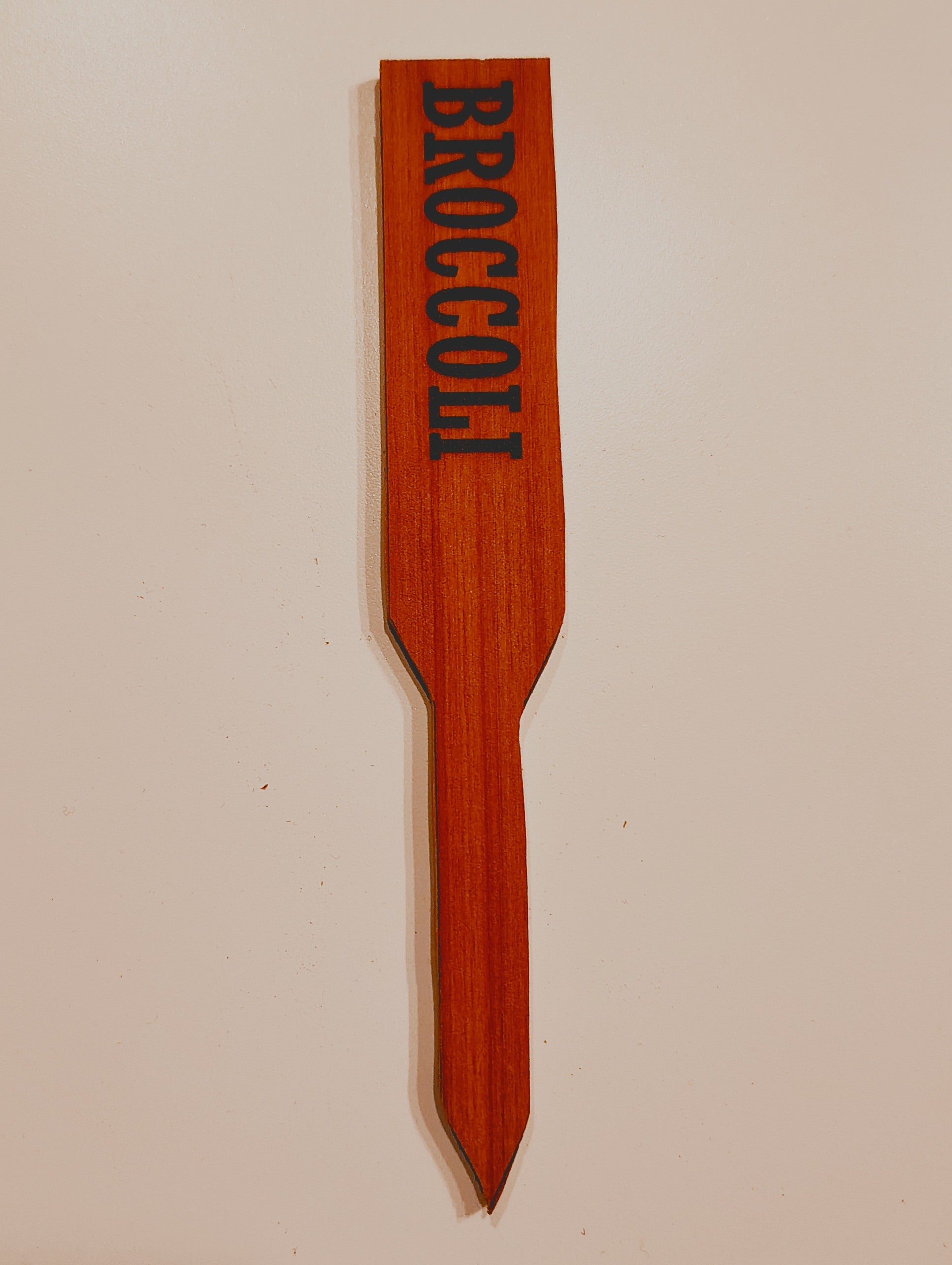 Plant marker made from aromatic red cedar. Approximately 5 inches long, 0.75 inches wide and 0.125 inches thick.