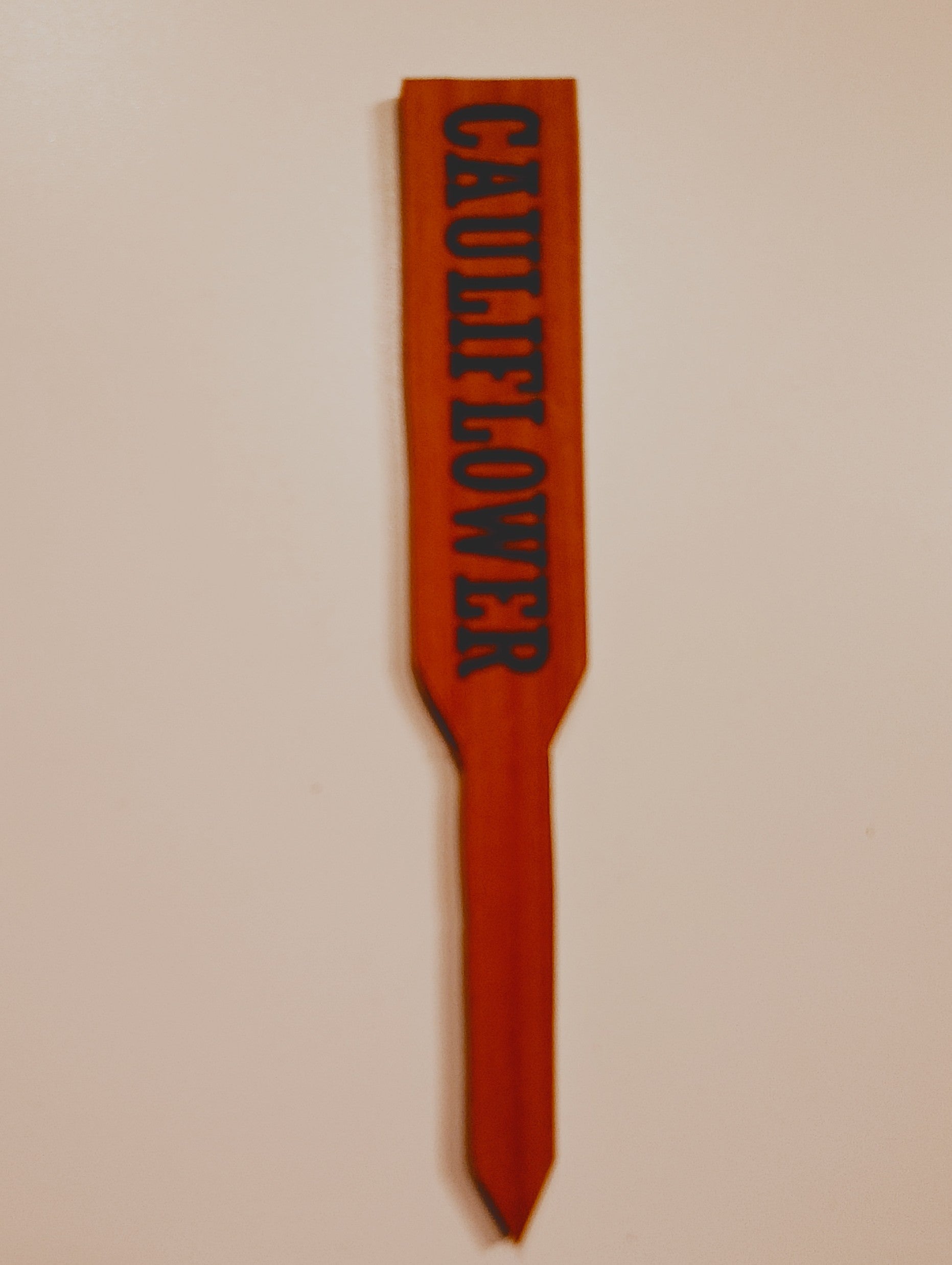 Plant marker made from aromatic red cedar. Approximately 5 inches long, 0.75 inches wide and 0.125 inches thick.