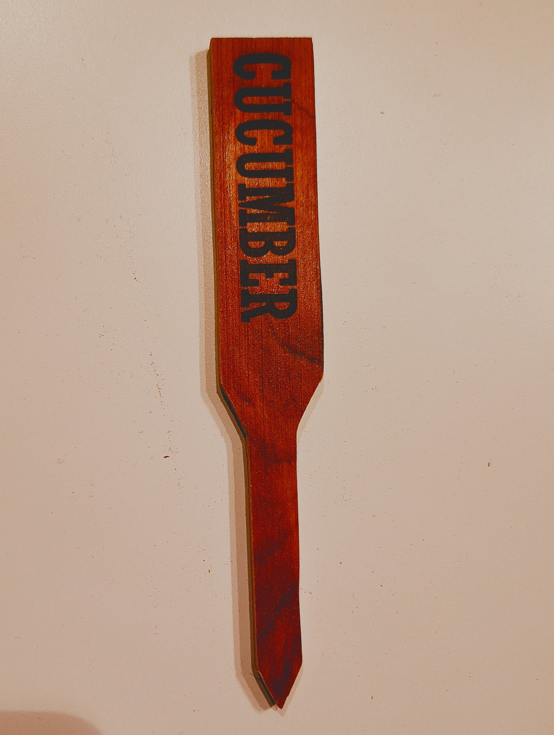 Plant marker made from aromatic red cedar. Approximately 5 inches long, 0.75 inches wide and 0.125 inches thick.
