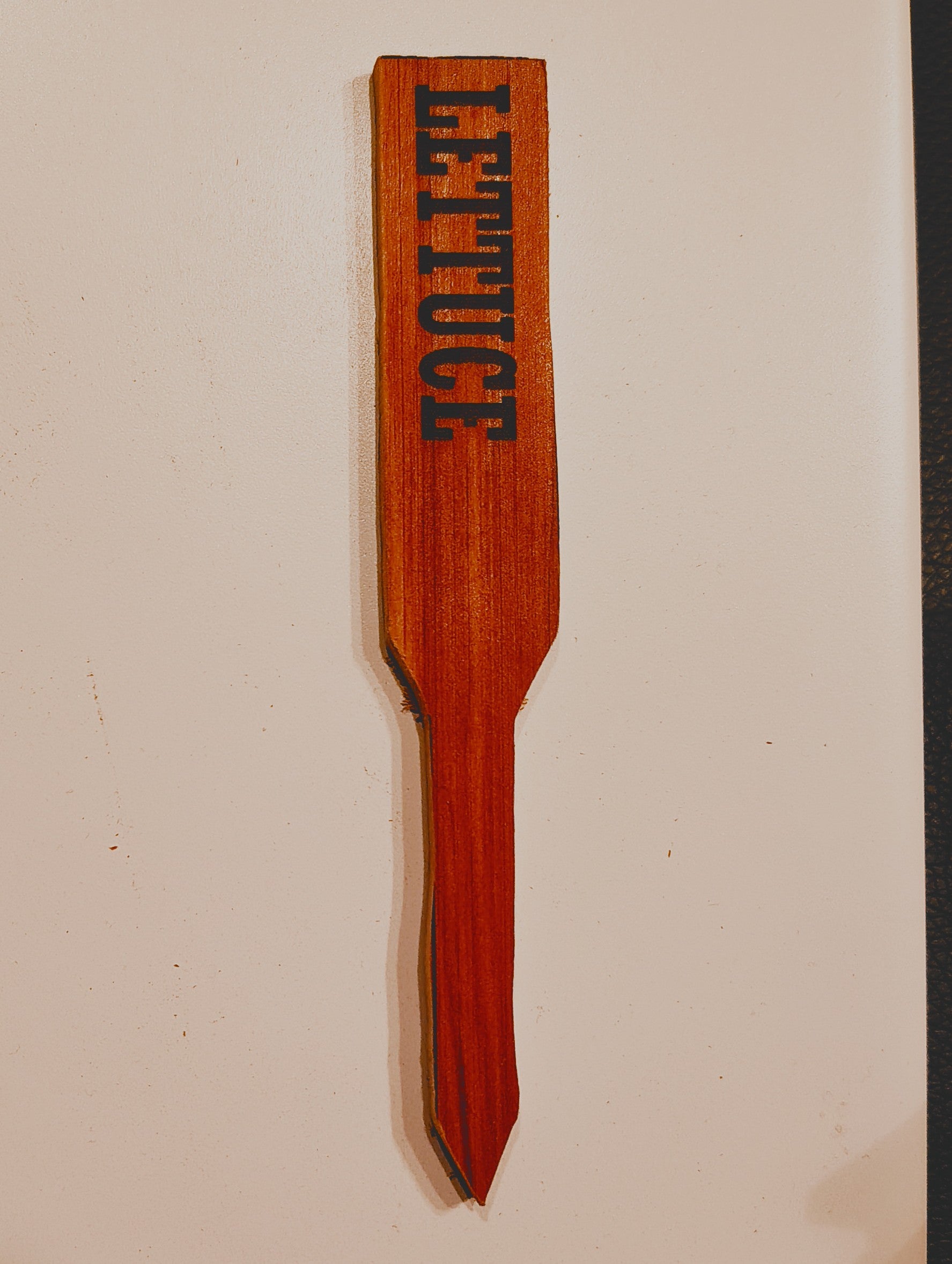 Plant marker made from aromatic red cedar. Approximately 5 inches long, 0.75 inches wide and 0.125 inches thick.