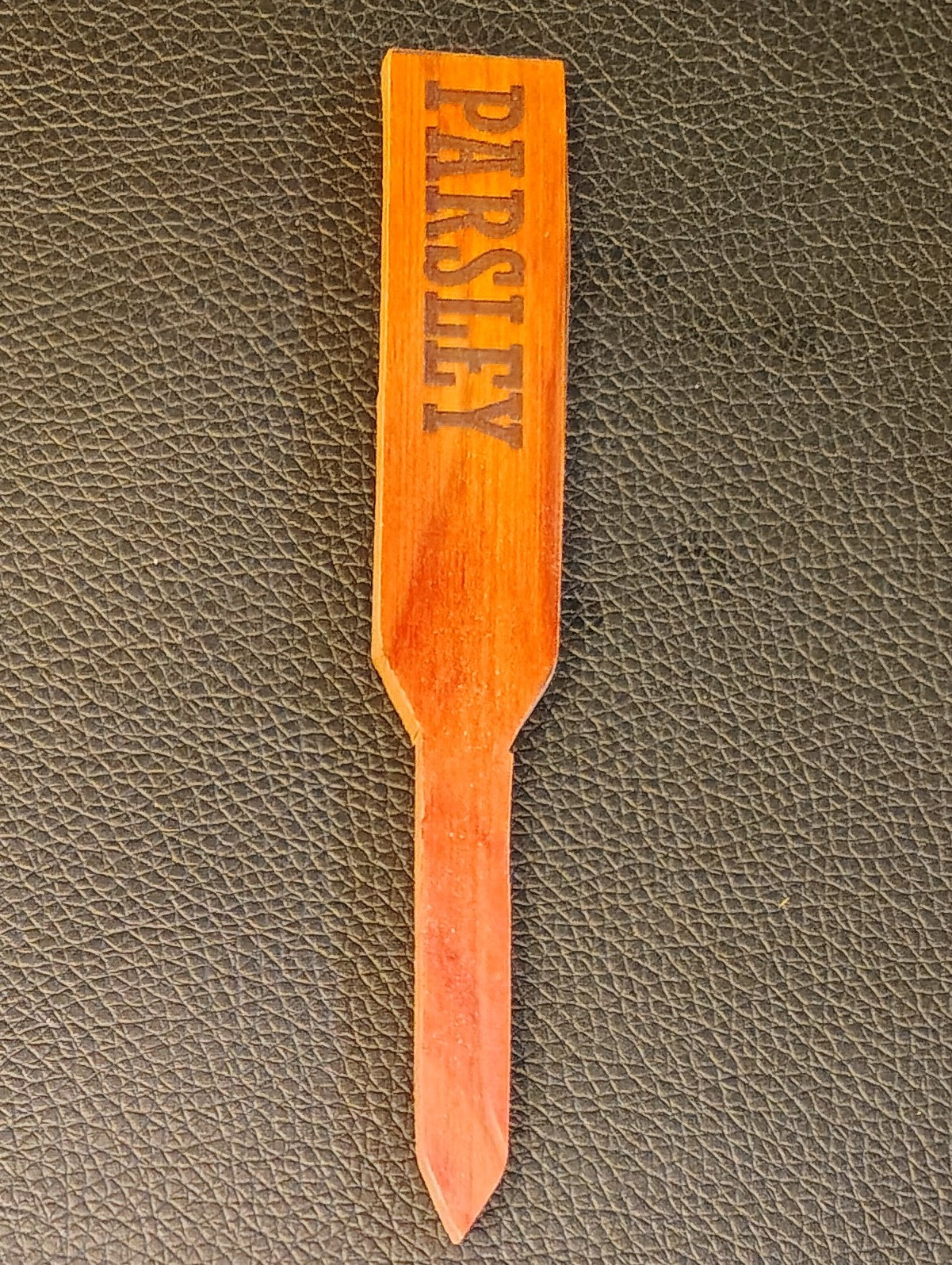 Plant marker made from aromatic red cedar. Approximately 5 inches long, 0.75 inches wide and 0.125 inches thick.