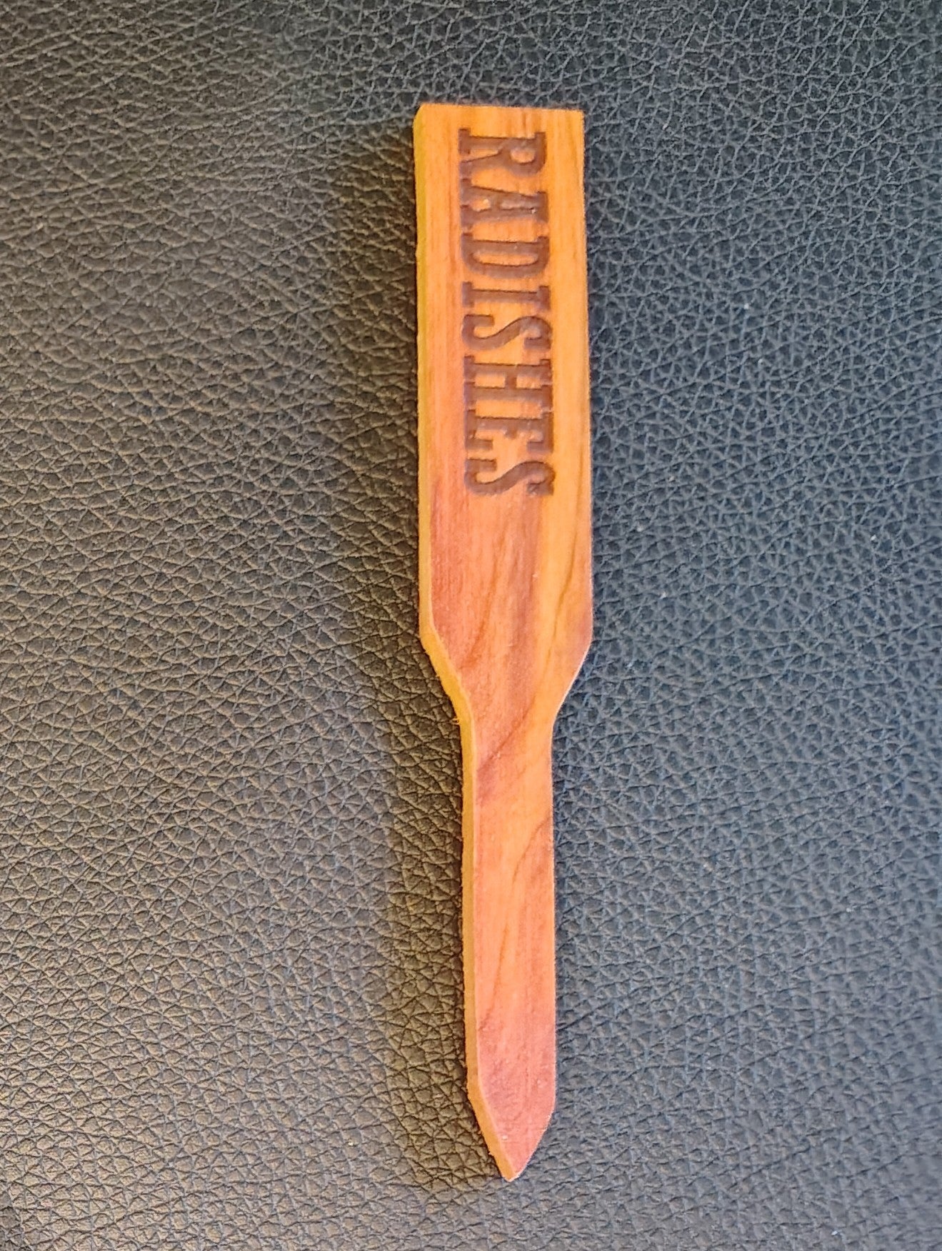 Plant marker made from aromatic red cedar. Approximately 5 inches long, 0.75 inches wide and 0.125 inches thick.