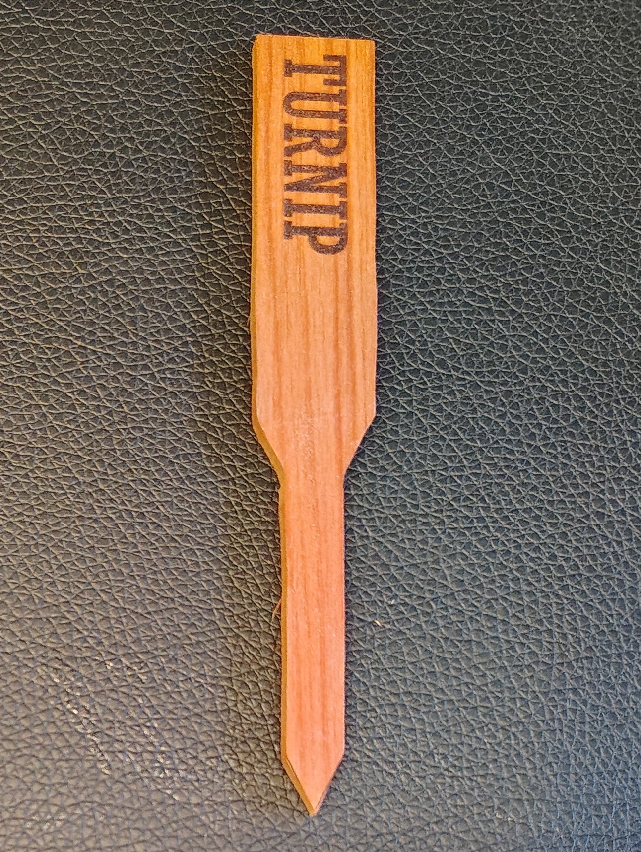 Plant marker made from aromatic red cedar. Approximately 5 inches long, 0.75 inches wide and 0.125 inches thick.